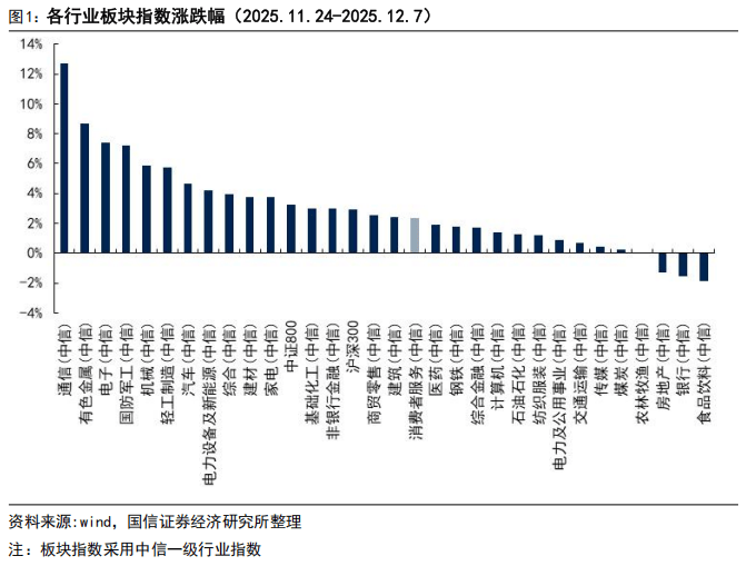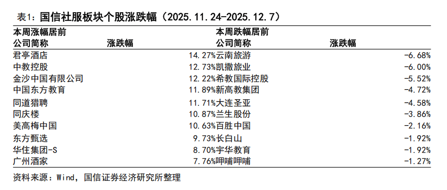 演讲期内(2025年11月24日-2025年12月7日),国信社服板块涨幅居前的股票为君亭酒店(14。27%)、中教控股(12。73%)、金沙中国无限公司(12。22%)、中国东方教育(11。89%)、同志猎聘(11。71%)、同庆楼、美高梅中国、东方甄选、华住集团-S、广州酒家。国信社服板块跌幅居前的股票为云南旅逛(-6。68%)、凯撒旅业(-6。00%)、希教国际控股(-5。52%)、新高教集团(-4。72%)、兰生股份、百胜中国、、宇华教育、呷哺呷哺。